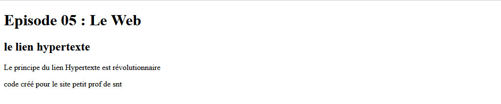 C'est pour cela que l'on parle de langage de balisage. On voit bien comment le site se structure en fonction de la taille des titres et de leur succession dans la page. La première balise d'un site internet est toujours : < !DOCTYPE HTML . Un site internet est toujours découpé en 3 parties : la tête (head), le corps (body), et les pieds (footer). On voit comment chaque partie commence et se termine par la même instruction : < head > pour commencer et < /head > pour terminer Chaque partie a ses spécificités : < Head > _ _ _ _ _ < /head > Cette partie concerne l'organisation de la page dans sa structure. C'est là que l'on va donner les instructions pour pouvoir dire quel style CSS va s'appliquer sur la page ou qu'on va donner le titre de la page tel qu'il va s'afficher dans le navigateur et non pas dans le contenu textuel de la page. Ainsi: < title > Petit_prof_de_snt : EPISODE 05 < /title > va s'afficher de cette manière DANS L'ONGLET du navigateur :