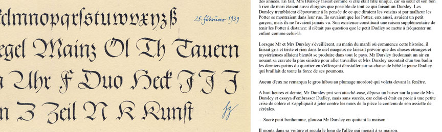 Dans l'exemple de gauche, une typographie dessinée par Hermann-Zapf-Gilgengart en 1939, les caractères sont créés grâce à la trace laissée par l'encre sur une feuille. C'est la forme de l'outil, une plume carrée, et le geste du dessinateur, qui donnent cette forme particulière aux lettres. A droite, il n'y a pas de geste et pas d'encre, juste des signaux lumineux qui SIMULENT la forme des caractères typographiques traditionnels pour permettre d'afficher un extrait du texte "Harry Potter à l'école des sorciers" de J.K. Rowling!