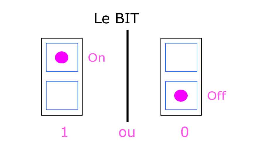 Le bit est l'unité élémentaire utilisée en informatique. C'est un interrupteur qui contient l'information la plus simple : elle ne contient que deux valeurs : vrai ou faux, traduit par 1 ou 0. Le langage informatique peut se résumer à compter avec des interupteurs !. Avec 1 seul BIT, on peut compter jusqu'a 1. Comment faire pour compter jusqu'à 3 ? Il n'y a qu'une seule solution possible : ajouter un autre BIT !