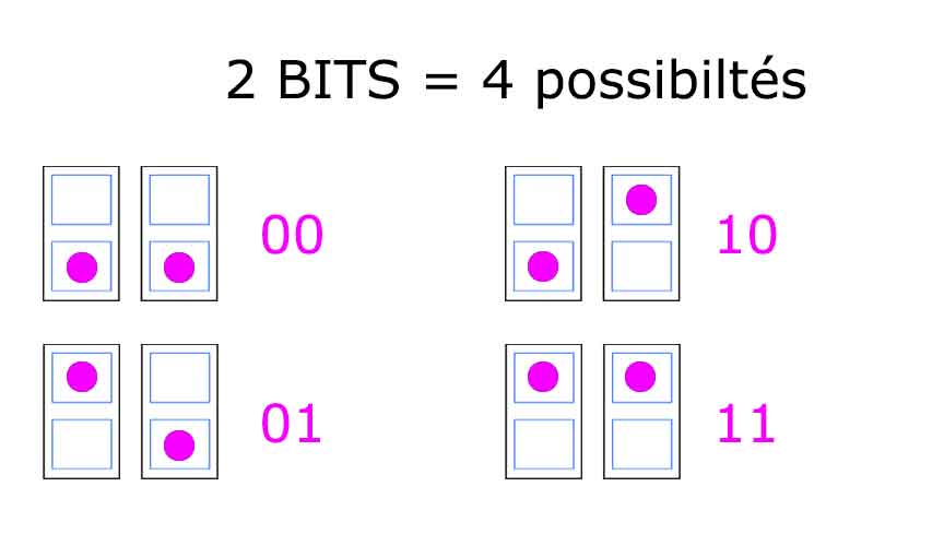 Avec 2 bits, il est possible d’obtenir 4 états (2*2) : 00, 01, 10, 11.
