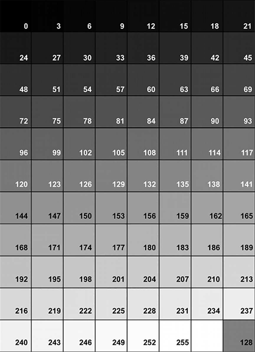 C'est la que l'informatique réalise tout son potentiel. C'est là ou l'on comprend la transformation du réel en nombres ! Dans une image en noir et blanc, on va associer la puissance de la lumière avec l' octet. Ainsi, Si la puissance de la lumière est faible, son code sera proche de 0, et à l'inverse, si elle la lumière est forte, blanche, son code sera proche de 255 : 00000000 =0 = noir 11111111 =255 = blanc 10000000 =128 = gris