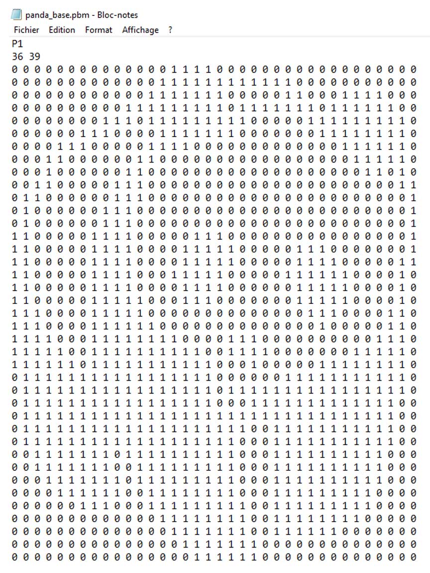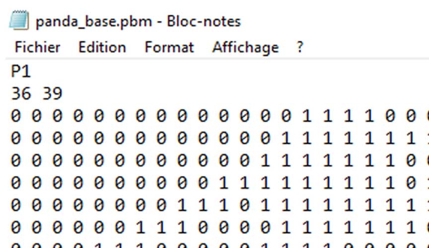 Un fichier .PBM commence toujours par un petit code, ici P1. Cela permet à l'ordinateur de bien vérifier qu'il s'agit d'un fichier pbm exact. Si le fichier ne commence pas par ce code, il ne fonctionnera pas. Ensuite, on trouve le nombre "36", il s'agit du nombre de pixels utilisés par ligne. Le nombre 39 correspond, lui, au nombre de pixels utilisés par colonnes. l'image est codée ligne par ligne en partant du haut, chaque ligne est codée de gauche à droite.