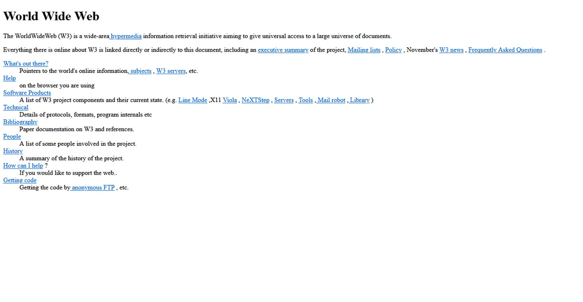 Voilà l'image du premier site internet de l'histoire. A l'époque, il n'y avait pas d'image, pas de son ,pas de vidéo juste... du texte et des liens hypertextes (les mots en bleu...), et c'est cela qui va changer le monde !