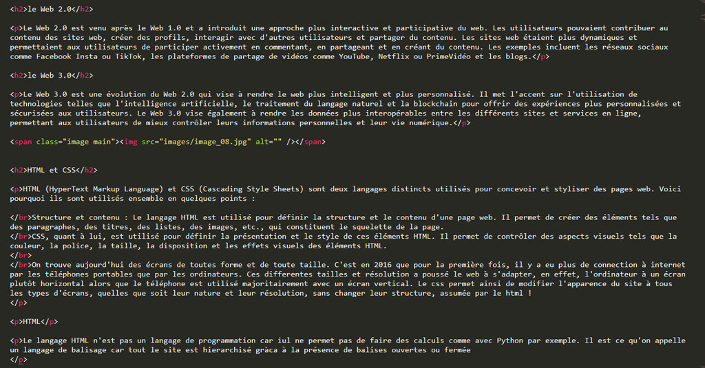 Le langage HTML n'est pas un langage de programmation car il ne permet pas de faire des calculs comme avec Python par exemple. Il est ce qu'on appelle un langage de balisage car tout le site est hierarchisé grâce à la présence de balises ouvertes puis fermées. Ces balises ont toujours le même fonctionnement : On commence une balise ouverte avec le signe < puis une instruction puis le signe >. On ferme la balise avec le signe puis la même instruction puis le signe >. Par exemple, pour écrire un paragraphe de texte, il faut donner les instructions suivantes : < p > voila le texte < /p > Notez que c'est la barre "/"" qui distingue une commande de fin d'une instruction du début.